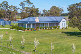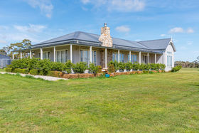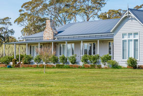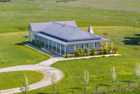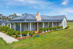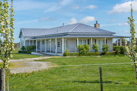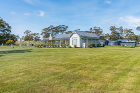 A tree-lined driveway, flanked by ornamental pear trees, leads to the residence, which is set privately in the centre of the property. A wide wrap-around veranda enhances the home's timeless appeal, while the Aspen Cultured stone chimney adds a striking architectural feature and a touch of warmth to the façade. Just steps away, a substantial stables and shedding complex includes a tack and feed room, secure workshop, and ample storage for rural equipment or vehicles"making it ideal for horse enthusiasts or hobby farmers.