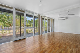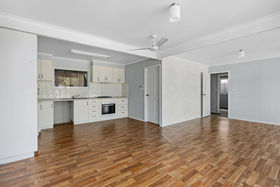 The living area includes a reverse-cycle split-system unit and a ceiling fan for climate control. Timber-look flooring extends through the living area and into the kitchen.